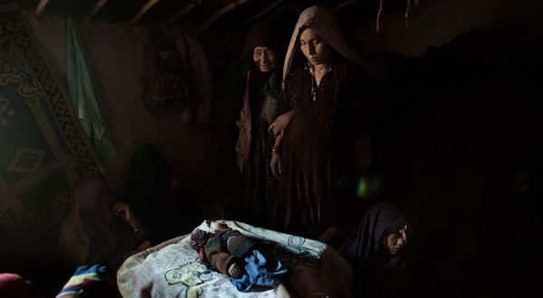 From the New York Times comes this powerful photo by photographer Andrea Bruce. It is lit almost like a Caravaggio painting, with its dramatic chiaroscuro. The lighting that falls on the averted face at the lower right adds, if it is possible, to the poignancy of the scene. (The original caption read: “In Grip of Cold, Afghan Family Mourns Death of 8th Child: The mother of Khan Mohammad, a 3-month-0ld boy who died because of exposure, in a camp in Kabul, Afghanistan.)