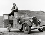 We see narrative again in the FSA photos, telling a narrative about desolation and dislocation. Here’s a rare photo: it shows the photojournalist Dorothea Lange – looking jaunty in her sneakers atop her old woody.