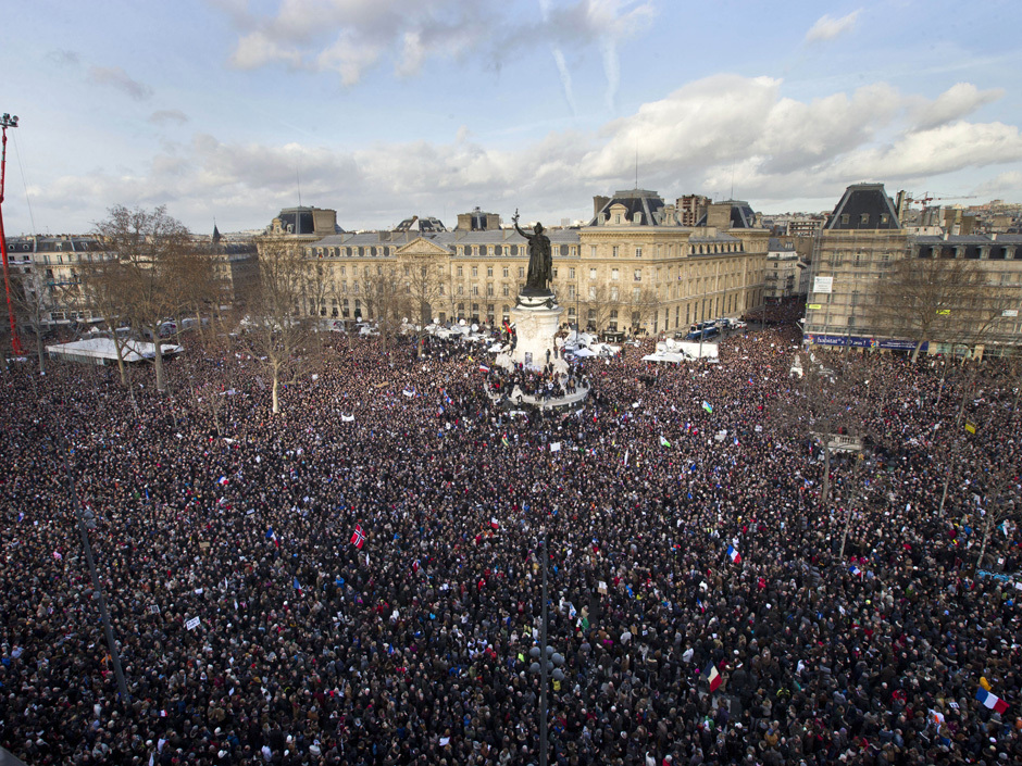 Thousands of people gather at Republique square in Paris, France, Sunday, Jan. 11, 2015.  Thousands of people began filling Franceís iconic Republique plaza, and world leaders converged on Paris in a rally of defiance and sorrow on Sunday to honor the 17 victims of three days of bloodshed that left France on alert for more violence. (AP Photo/Peter Dejong)
