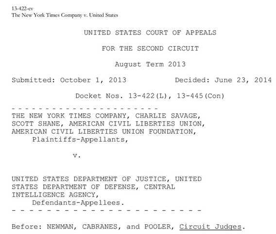 Meanwhile, kudos to the Times‘ Charlie Savage and Scott Shane, who are named among the plaintiffs who pried this decision out of the courts, along with the Times itself and the ACLU. No matter what we each think about the president and his policies, these plaintiffs have done the whole country a service. Thank you.